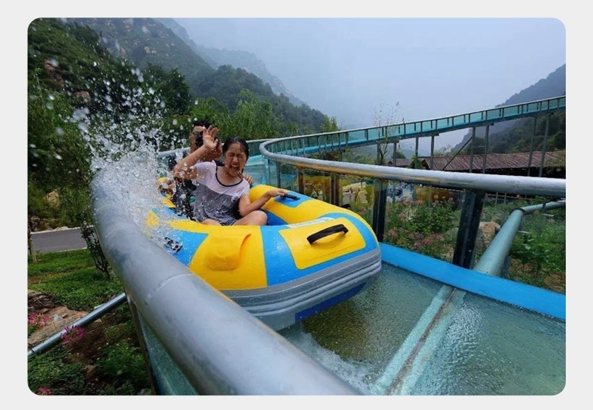 首先說明的是水滑道漂流的用水量是450-500立方/小時,用水泵把水抽到起點,水是循環利用的,漂流過程中并不浪費水,平均到每個人身上電費也就幾毛錢。如果條件允許最好是在漂流上站修建一個足夠一小時用水的蓄水池,當然越大越好。其次,從刺激程度上討論,水滑道漂流和滑漂同樣刺激。區別在于滑漂完全用坡度控制速度,而水滑道漂流是用水和坡度結合控制速度。滑漂對坡度有嚴格的限制。坡度不能過小,小了不走,過大了危險,船會飛出的。水滑道漂流對坡度的限制要遠小于滑漂,即便是水滑道漂流槽水平十幾米,船都可以快速通過,當然水滑道漂流對坡度并不是沒有要求,落差越大,我們就可以把水滑道漂流做的越刺激,可以根據您的預算把漂流滑槽做的越長,增加游客的體驗感,體檢感上去就可以把票價抬高,增加收入。最后從接待能力上說,滑漂,船和船之間至少要留有100米-200米甚至更多的安全距離。而水滑道漂流只需2-5米的安全距離。接待量可想而知。經過以上分析和判斷,并不是說滑漂這種形式的漂流不好,而是水滑道漂流的優勢遠高于滑漂,最終要修建哪種漂流?投資開發商可以根據自己的需求選擇!